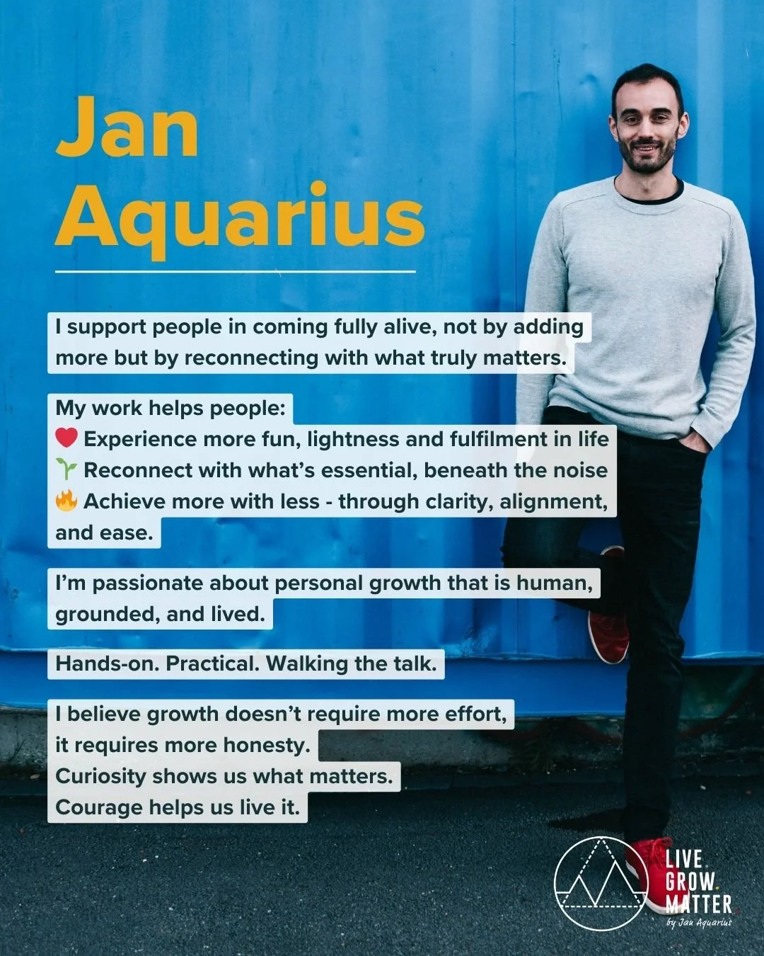 This is what I’ve tried to structurally answer in the last years and is the reason I’ve created LGM (Live. Grow. Matter.). It led to coaching, breathwork and training programs that help you do exactly that: live in a lighter way, more in line with your own desires, achieving more of what you want while experiencing more joy and more fulfilment.