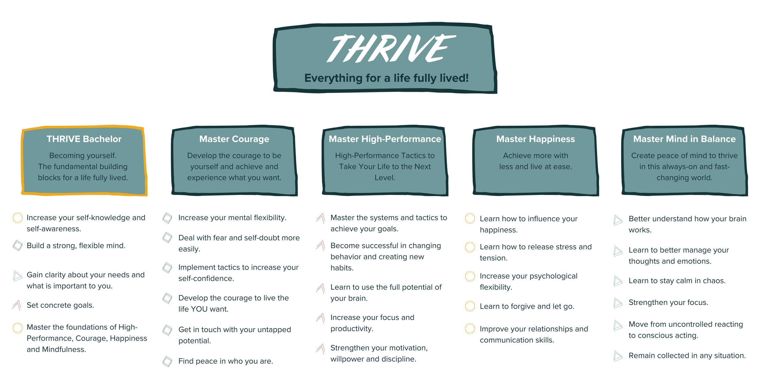 Can I choose which masterclasses to purchase within the program? 👉 Yes! Each masterclass offers standalone value and can be purchased individually. However, the overarching programs (THRIVE Bachelor and the four THRIVE Masters) come at a bundle price that’s lower than the sum of the individual masterclasses. These comprehensive programs increase the likelihood of lasting change by guiding you through all the necessary steps of the growth process in a structured and deeper way.